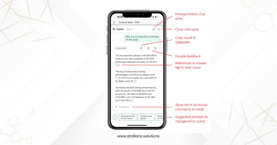 - The enlarged Copilot chat view provides controls for interacting with responses, making Power BI in mobile apps even more user-friendly.