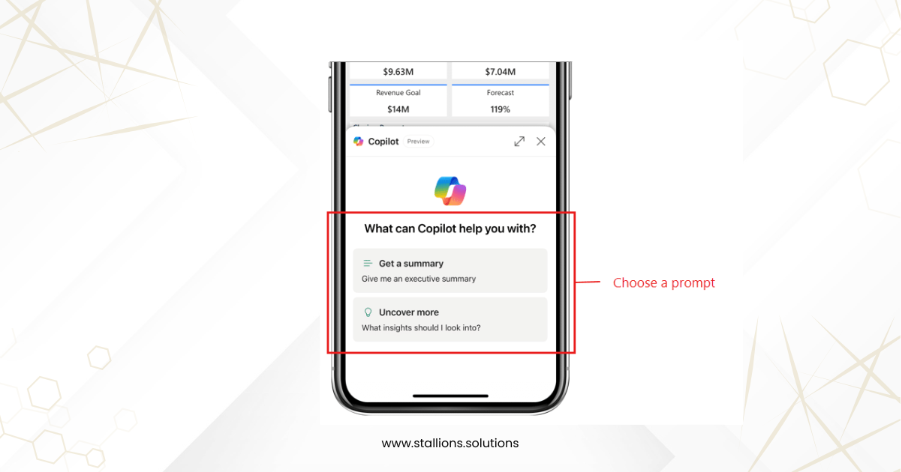 - In the chat window that opens, select the prompt that best fits your needs for generating summaries and insights. Copilot offers predefined prompts to help you quickly uncover key information without manual effort making Power BI in mobile apps even more intuitive and efficient.