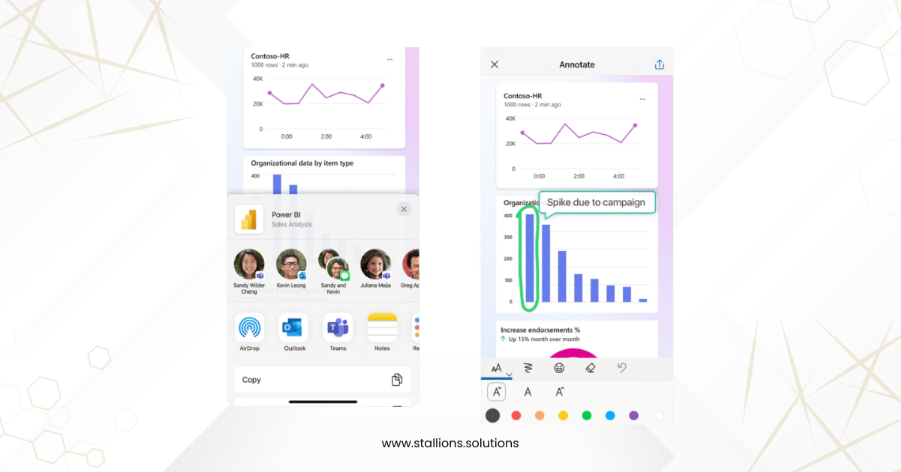 Power BI in mobile apps makes teamwork effortless by enabling real-time collaboration on the go. You can annotate reports directly on your touch-enabled screen, highlighting key insights or emphasizing specific data points to guide your team’s focus. Sharing is just as simple—send live reports and dashboards straight from the app to keep everyone aligned and informed, no matter where they are. With Power BI mobile apps, collaboration becomes faster, smarter, and more effective.