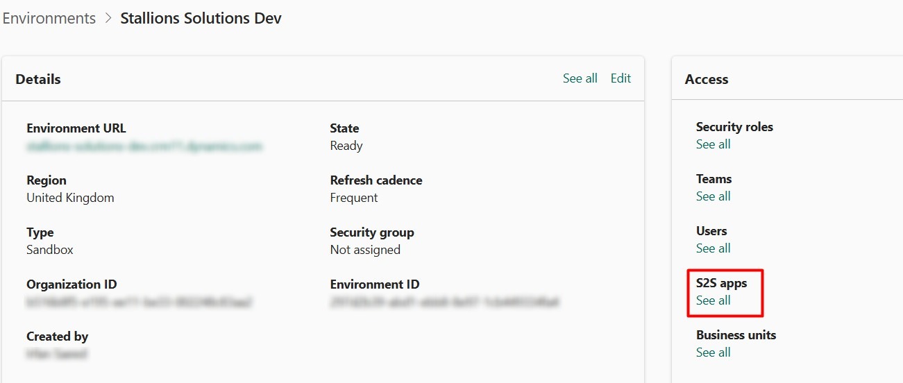 - Open the Power Platform Admin Center as a System Administrator, and select your Power Platform Environment, then select S2S Apps.