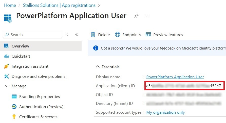 After creating the App registration, copy the Application (client) ID. This will serve as the Client ID for later configuration.